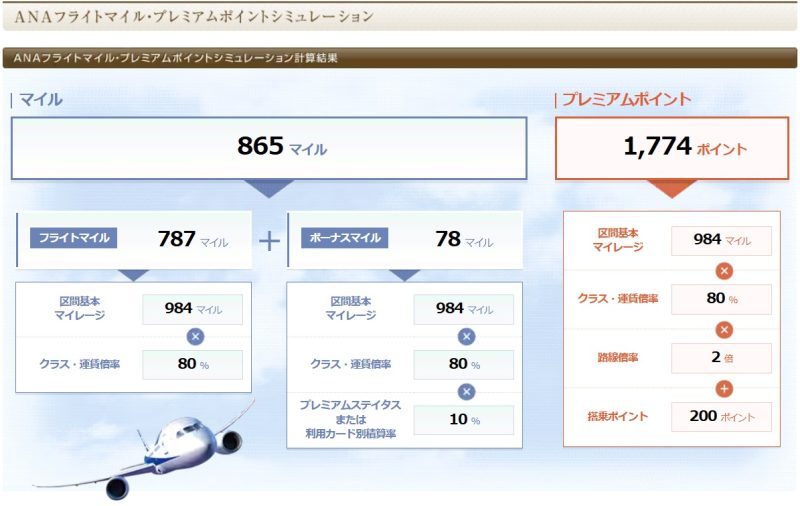 この場合、865マイルの獲得となります。往復しても、1,730マイルですね。