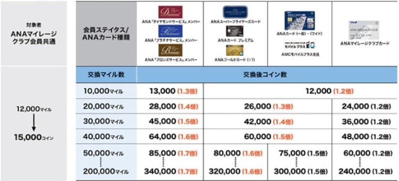 会員ステイタスやANAカードの種別によって、交換率が変わります。