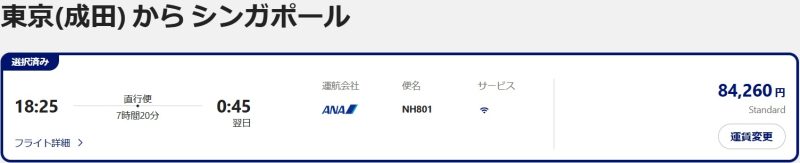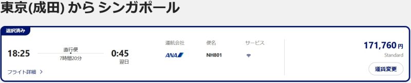 一例として、成田→シンガポール便、エコノミークラス、スタンダード運賃で検証しました。