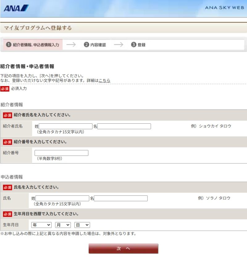 紹介者氏名と紹介者番号を入力する項目があるので、以下の内容を入力します。