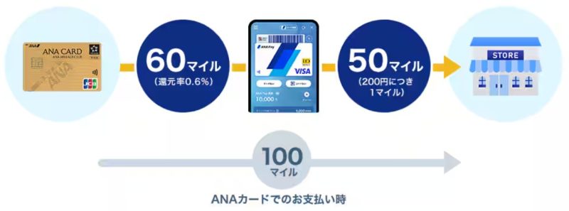 ANA Payにチャージしてから支払うことで、チャージ分で還元率0.6%の60マイル、決済分で50マイルになりますので、合計110マイルになります。