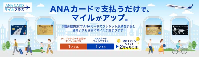 通常の決済分に加えて、ANAカードマイルプラスで通常1マイルが2マイルになります。
