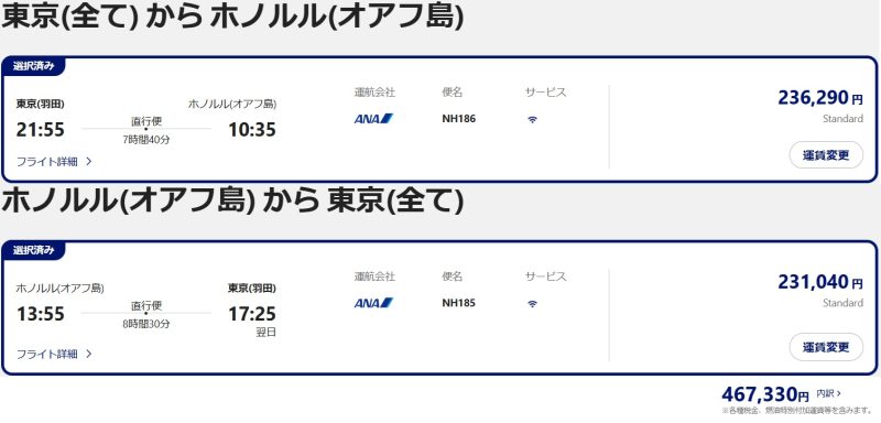 ちなみに東京↔ハワイをレギュラーシーズンにビジネスクラスの航空券を購入しようとすると467,330円かかります。